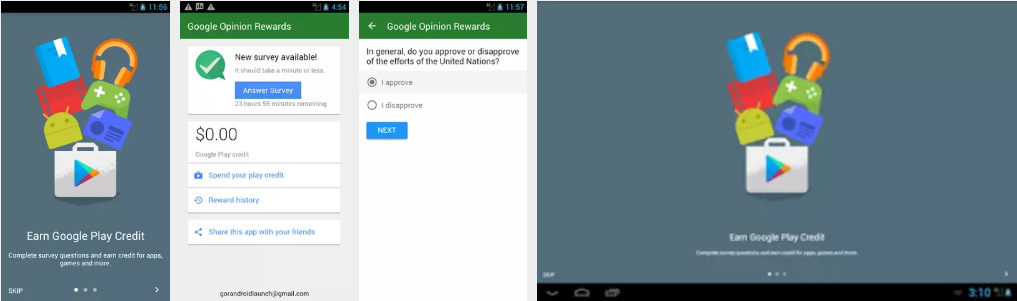 Android users can respond to a survey from Google and receive up to $1 in Play credits, but the credits vary, depending on the survey. Download the app, answer a few questions about yourself and wait to receive your first questionnaire. Expect to receive an average of one survey per week, covering topics such as “Which logo is best?” and “When do you plan on travelling next?”