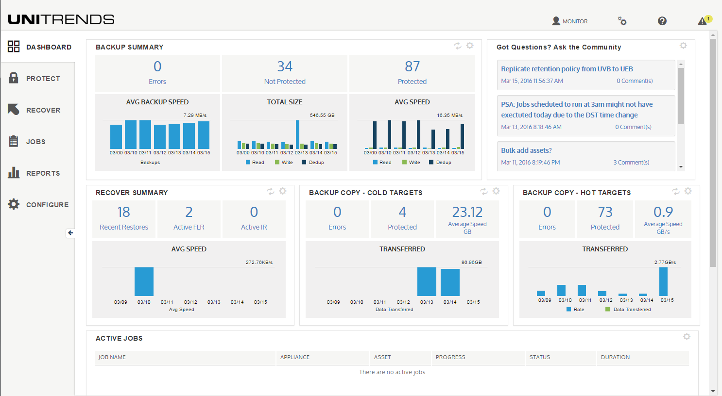 I love when you buy an appliance that you don’t have to worry about individual server licences. only limited to space on your appliance. Support is always there to help. Our local company that sells Unitrends offers training every so often, so really nice to talk to others and learn best practices. Networking with out users of the products really helps feel better about the product.