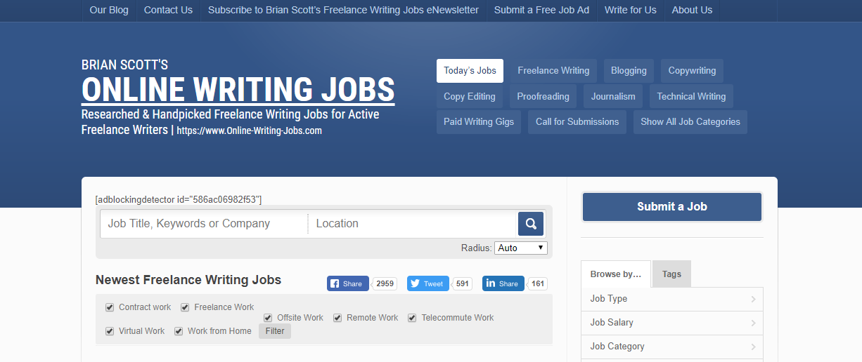 This job board includes fairly wide writing categories that include writing, blogging, copy writing, copy editing, technical writing, journalism, call for submission, and several more.