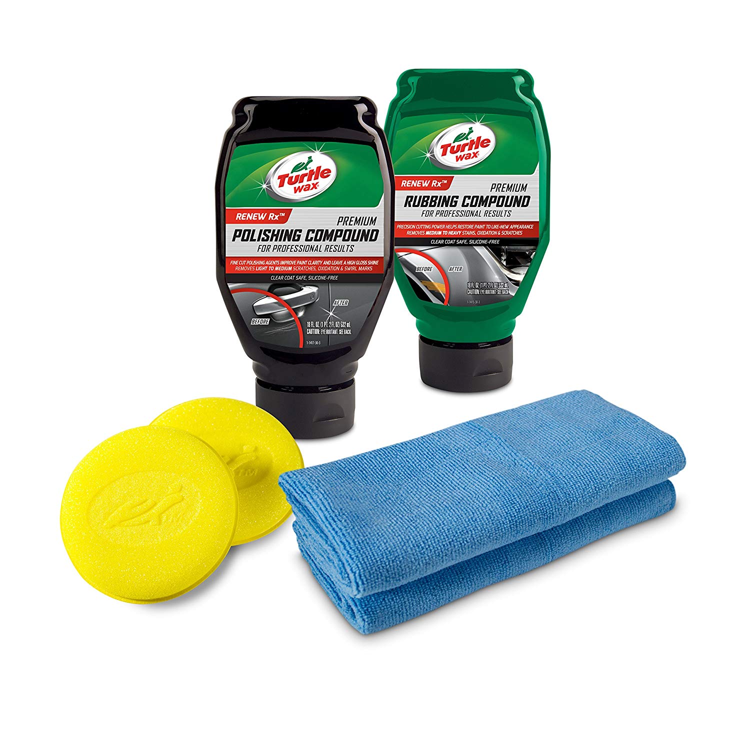 The Turtle Wax Complete 6-Piece Compound, Polishing & Scratch Kit was put together by Turtle Wax experts to provide the solutions to some of the most common automotive issues. Scratches, swirl marks, dullness and oxidation are common ailments to a car’s exterior. The Turtle Wax Complete 6-Piece Compound, Polishing & Scratch Kit contains the tools you need to restore your paint. Premium Polishing Compound is formulated with fine cut ingredients and professional grade lubricating oil to remove light scratches and swirl marks. For heavier blemishes, oxidation, severe scuffs and abrasions Premium Rubbing Compound is formulated with unique compounds to restore paint to like-new. The kit also comes with 2 foam applicator pads and 2 microfiber towels to help apply both products and buff out imperfections.