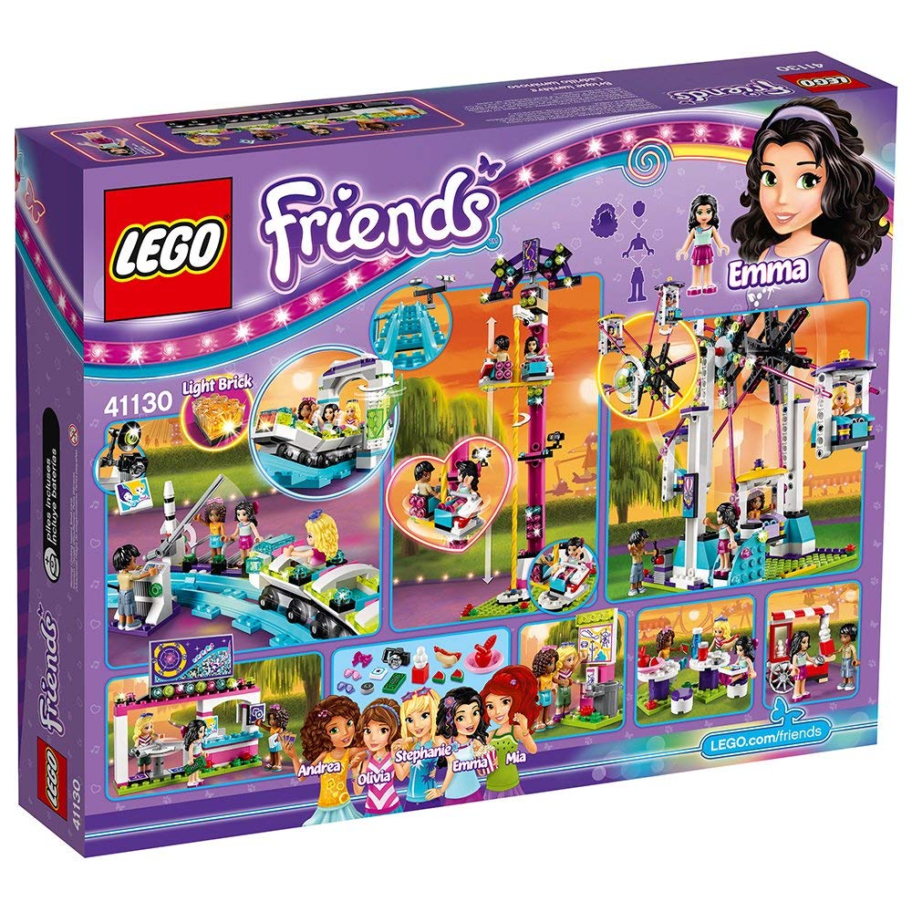 Lego Friends Amusement Park Roller Coaster 41130 Toy for Girls and Boys. Build an amusement park featuring a roller coaster with four carriages, drop tower and Ferris wheel, plus lots of accessories. Includes 4 mini-doll figures: Emma, Andrea, Matthew and Naya, all in summer outfits