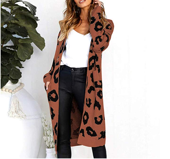 This Women Leopard Cardigan is both soft comfortable and warm! It features long sleeves, two sides pockets and long length which makes it perfect for the cooler months