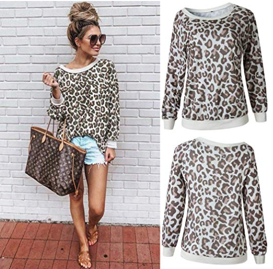 1. Casual Leopard Pullover Long Sleeve Sweatshirts Top Blouse