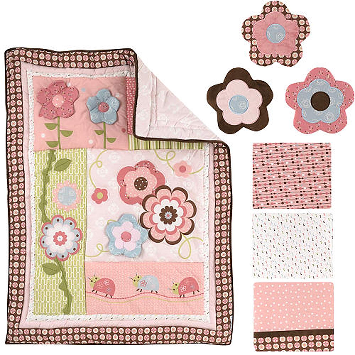 Decorate the nursery with this adorable pink floral themed bedding set by Graco. Decorated with a pretty floral prints and 3D appliques in shades of pink. This quilt features colors of pink, brown and green. The 7 piece bedding set includes a quilt, 2 fitted sheets, dust ruffle, and three pieces of fabric wall art.