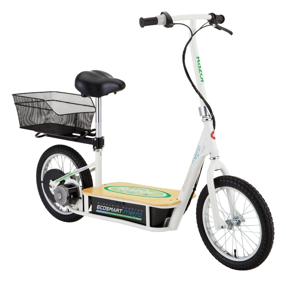 EcoSmart Metro Electric Scooter: The Advanced Street Systems by Razor. Designed for true neighborhood transportation. Clean! Green! No gasoline needed! The EcoSmart Metro Electric Scooter is fun, and most of all affordable. Reduces pollution and conserve energy with the Metro Scooter! This Electric Scooter combines comfortable, style, and functionality with its ultra padded seat, rear disc braking system, adjustable handlebar rake and seat, detachable luggage rack/rear fender, bamboo deck, and stylish powder coated frame. Using standard bicycle size 16” pneumatic tube tires on spoke wheels makes for easy replacement. Powered by a 500W extra high torque motor and 36-volt electrical system, 7 AH (amp-hour) battery. Just twist and go with the variable speed hand throttle control. Battery weight is also balanced on center line of frame. Travels 18-20 Miles per hour and has a running time up to 60 minutes. Recommended for riders up to 220 lbs. Some assembly required -Tools included.