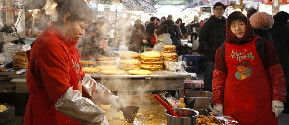 This sprawling fabric market is now best known as Seoul’s busiest meokjagolmok (food alley), thanks to the 200 or so food stalls, kimchi and fresh-seafood vendors that have set up shop amid the silk, satin and linen wholesalers. It’s a hive of delicious sights and smells. Foodies flock here for the golden fried nokdu bindaetteok (mung-bean pancake; ₩4000 to ₩5000) – paired beautifully with makgeolli (milky rice wine).